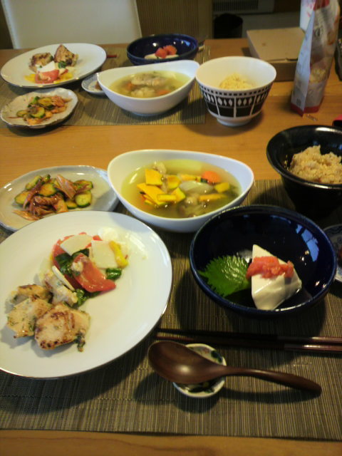 今日の昼御飯はかぶとトマトバジルソースにチキンココナッツオイルと塩麹あえ(これ美味しかった!)に、キュウリと茗荷のキムチあえ、15種類の野菜チキンスープ(スープは一番人気)とやっこめんたいに玄米とヘンプナッツご飯にハニー梅干し!スタッフ一同美味しく頂きました。家族は風邪ぎみで体温めないと…。 食は健康を3支えますね(^-^)/ さて仕事!